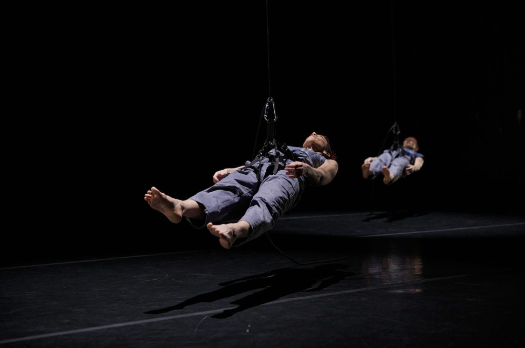 In the end it is just them and four empty plastic bags. Holding one bag and each hand, they raise the bags above their heads before forcing their arms downwards, inflating the bags with air with one swift motion. They move across the rubble ridden room like this, catching the air over and over. They settle into a steady audible rhythm – the gasp of the plastic through the air is like a forceful exhale, a required exercise of living. We can trust that there is an inhale as their arms raise silently up, the exhale pushed out immediately as they force the bags down. As the lights fade and the sound continues, they have captured my own state of suspension inside the impending apocalypse. I find myself exhaling at the moment the gasp of plastic occurs, my own balancing breath caught inside the inhale/exhale of theirs.
